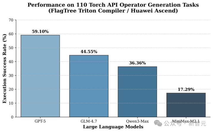 在统一使用 FlagTree Triton 编译器、并以华为 Ascend平台为目标硬件的条件下,评测对比了多种主流大模型在 110 个 Torch API 算子生成任务中的表现,重点统计其执行正确率(数值准确性通过)。